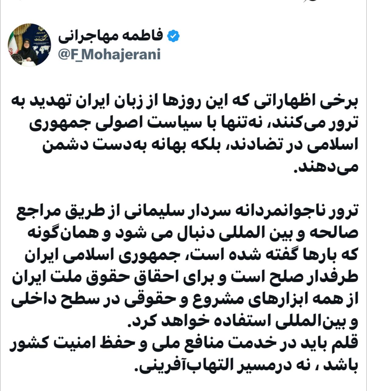 🔹ترور ناجوانمردانه سردار سلیمانی از طریق مراجع صالحه و بین المللی دنبال می شود و همانگونه که بارها گفته شده است، جمهوری اسلامی ایران طرفدار صلح است و برای احقاق حقوق ملت ایران از همه ابزارهای مشروع و حقوقی در سطح داخلی و بینالمللی استفاده خواهد کرد.